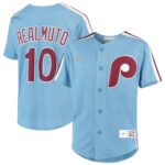 This Philadelphia Phillies JT Realmuto Alternate Replica Player Jersey has the styling, material, and graphics youll be proud to wear. It features vivid logos and colors, a tailored fit for movement, and interlocking moisture-wicking fabric for a lightweight, breathable feel.